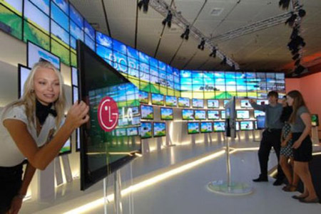 除3D技術外,過去幾年IFA上,超薄電視機一直都是展覽的熱點。當電視廠商將電視機的屏幕尺寸突破100英寸之后,他們開始轉而關注電視的厚度。在這張照片中,一名模特正在展示一款LG超薄電視。