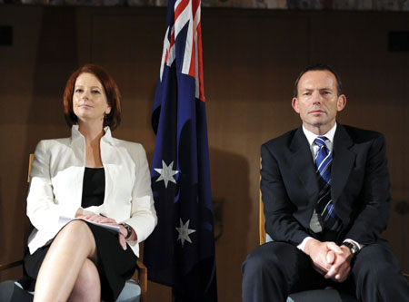 9月7日,在澳大利亞堪培拉舉行的榮譽士兵紀念日活動上,澳大利亞總理、工黨領袖吉拉德(左)和反對黨領袖艾伯特坐在國旗兩側(cè)。工黨當日下午宣布獲得澳大利亞聯(lián)邦選舉最終勝利,吉拉德將組建新一屆政府。