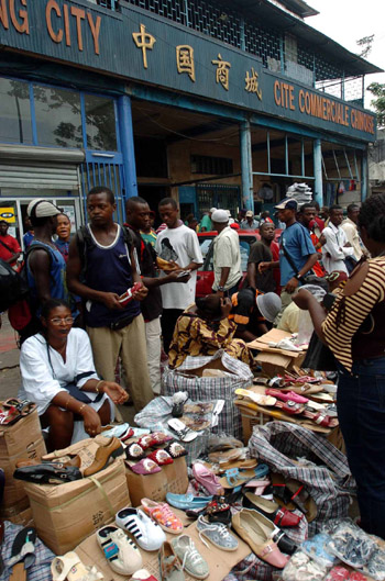 中國商品在非洲。中國商務(wù)部的數(shù)據(jù)顯示,2000年中非貿(mào)易額首次突破100億美元,2008年突破1000億美元,年均增速在30%以上。2009年,中國成為非洲第一大貿(mào)易伙伴國。今年上半年,中非貿(mào)易額已達(dá)612億美元,同比增長65%,全年有望再超千億美元。圖為在喀麥隆杜阿拉的中國商城,當(dāng)?shù)匦∝準(zhǔn)圪u中國商品。新華社發(fā) |