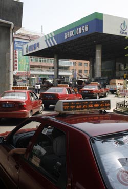 在烏魯木齊市蘇州路加氣站旁,等待加氣的車輛排成了長隊。新華社記者 王菲