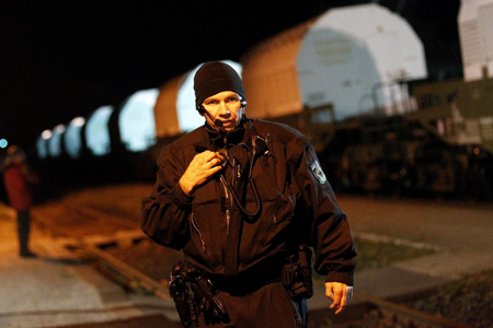 11月8日,在德國丹嫩貝格,一名防暴警察在運載核廢料的列車旁工作。 運載核廢料的列車當日抵達終點站德國丹嫩貝格。列車從法國出發(fā)以來,反核抗議者在沿途鐵路用各種手段阻止列車行進。數(shù)千名抗議者7日與警方?jīng)_突升級,雙方陷入“混戰(zhàn)”。