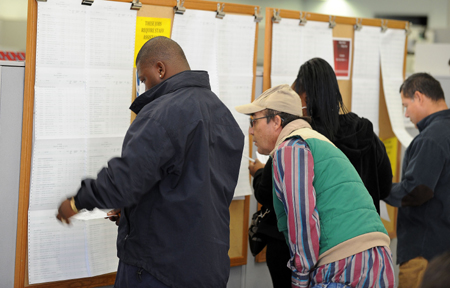 11月9日,在美國城市拉斯韋加斯,當(dāng)?shù)鼐用裨谝粋(gè)職業(yè)介紹中心里查看招聘信息。 據(jù)報(bào)道,美國勞工部上周的數(shù)據(jù)顯示,美國10月份凈增就業(yè)人數(shù)超過15萬人,超過一些經(jīng)濟(jì)學(xué)家的預(yù)期。但美國眼下的失業(yè)率仍接近10%。