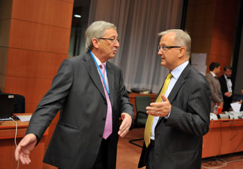 11月16日,歐元集團(tuán)主席、盧森堡首相容克(左)在比利時(shí)首都布魯塞爾舉行的歐元區(qū)財(cái)長會(huì)議上與歐盟委員會(huì)負(fù)責(zé)經(jīng)濟(jì)與貨幣事務(wù)的委員雷恩交談。當(dāng)天,歐元區(qū)財(cái)長會(huì)議在布魯塞爾舉行。由于近來愛爾蘭、葡萄牙等歐洲國家的債務(wù)形勢緊張,外界普遍擔(dān)心歐洲國家會(huì)陷入第二輪主權(quán)債務(wù)危機(jī)。新華社記者