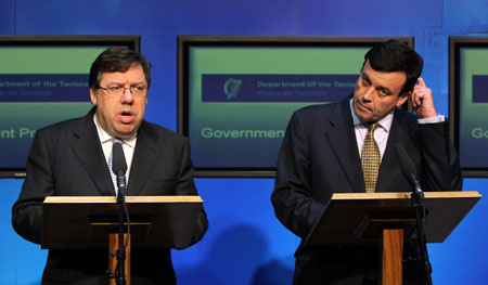 11月21日,愛(ài)爾蘭總理布賴恩·考恩(左)和財(cái)政部長(zhǎng)布賴恩·勒尼漢在首都都柏林出席記者招待會(huì)。考恩當(dāng)晚說(shuō),愛(ài)爾蘭向歐洲聯(lián)盟(歐盟)和國(guó)際貨幣基金組織(IMF)提出的一攬子金融援助請(qǐng)求已經(jīng)獲得歐盟的批準(zhǔn)(相關(guān)報(bào)道見(jiàn)四版)