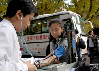 北大學(xué)子無(wú)償獻(xiàn)血應(yīng)對(duì)“血荒”。10月31日,北京大學(xué)校園內(nèi),剛滿18歲的學(xué)生韓旭測(cè)量血壓準(zhǔn)備獻(xiàn)血。 新華社發(fā)(趙琬微/攝) |