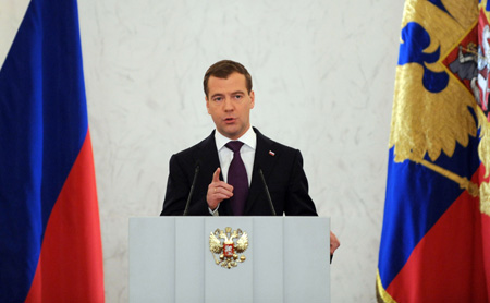 俄羅斯總統(tǒng)德米特里·梅德韋杰夫11月30日向俄聯(lián)邦議會兩院發(fā)表國情咨文時表示,預(yù)計(jì)全年GDP增長將達(dá)到約4%。未來三年,政府將把年通脹率控制在4%至5%的水平。他還表示,金融危機(jī)的影響并未完全消除,俄政府仍將無條件履行自身的社會責(zé)任。