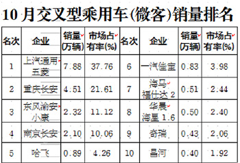 10月份,交叉型乘用車(微客)銷售20.87萬輛,環(huán)比增長6.87%,同比增長19.17%,成為乘用車中惟一環(huán)比同比雙增長的車型,這已是微客連續(xù)兩月保持此殊榮。