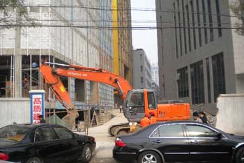 在合肥市重點(diǎn)工程——金鷹國(guó)際購(gòu)物中心項(xiàng)目工地,一臺(tái)挖掘機(jī)停放在工地入口處。據(jù)一名工人介紹,11月2日晚,該工地突然出現(xiàn)了多名不明身份人員,隨后3輛大型挖掘機(jī)停放在工地,封堵了該工地出入口及施工現(xiàn)場(chǎng),造成該工地正常施工中斷。截至12月2日,仍有一臺(tái)挖掘機(jī)停放在工地現(xiàn)場(chǎng)。