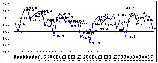 中國(guó)非制造業(yè)商務(wù)活動(dòng)指數(shù)走勢(shì)圖(%) |