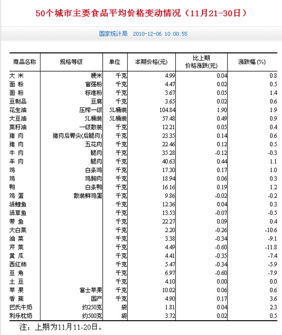 國家統(tǒng)計局6日發(fā)布的近期50個城市主要食品平均價格變動情況 |