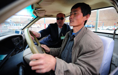 ▲在準(zhǔn)格爾國(guó)安駕校,46歲的薛家灣鎮(zhèn)阿岱溝村農(nóng)民李貴云(右)在老師的指導(dǎo)下學(xué)習(xí)駕駛。近年來(lái),鄂爾多斯通過(guò)“定向培訓(xùn)、促進(jìn)就業(yè)”和“補(bǔ)貼學(xué)費(fèi)、免費(fèi)培訓(xùn)”等方式,對(duì)農(nóng)村剩余勞動(dòng)力進(jìn)行職業(yè)技能培訓(xùn)。