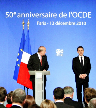 總部設在巴黎的經(jīng)濟合作與發(fā)展組織(簡稱“經(jīng)合組織”,OECD)13日在法國總統(tǒng)官邸愛麗舍宮舉辦成立50周年招待會。圖為經(jīng)合組織秘書長安赫爾·古里亞(左)和法國總統(tǒng)薩科齊在招待會上發(fā)表講話。該組織當天公布的歐元區(qū)經(jīng)濟評估報告指出,歐元區(qū)貿(mào)易失衡和債務危機為后期經(jīng)濟發(fā)展蒙上陰影,目前地區(qū)層面的金融監(jiān)管和財政紀律都有待加強。經(jīng)合組織是成立于1961年的一個政府間國際組織,成員多為歐美和亞洲的經(jīng)濟發(fā)達國家。