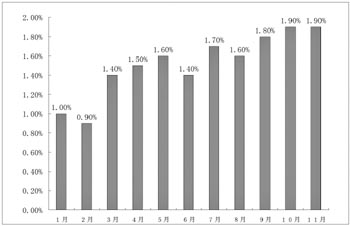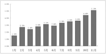 4月份我國(guó)CPI同比上漲2.8%,漲幅創(chuàng)出自2008年11月份以來的18個(gè)月新高;5月份CPI同比上漲3.1%,年內(nèi)首次突破3%的溫和警戒線;7月份CPI同比上漲3.3%,隨后8月份同比上漲3.5%,9月份上漲3.6%,10月份4.4%,11月份5.1%,漲幅連續(xù)5個(gè)月逐次創(chuàng)出今年新高。從1月份的CPI同比上漲1.5%,到11月份的上漲5.1%,物價(jià)問題可以說是今年經(jīng)濟(jì)各界最關(guān)心的問題之一。