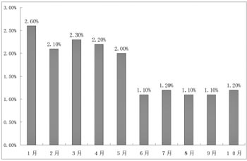 其次,消費(fèi)品價(jià)格有可能繼續(xù)上升。今年1至9月我國(guó)居民消費(fèi)價(jià)格上漲了2.9%,已經(jīng)逼近3%的預(yù)期目標(biāo)。由于受自然災(zāi)害、成本上升和國(guó)際糧價(jià)上漲等因素的影響,食品的價(jià)格上升較快。其中,糧食上漲10.9%,肉禽及制品上漲0.9%,蛋上漲5.8%,水產(chǎn)品上漲7%,鮮菜上漲20.2%,鮮果上漲12.2%。今后幾個(gè)月,受國(guó)際糧價(jià)推高和種糧成本上升等因素影響,這些產(chǎn)品的價(jià)格還可能保持在高位。