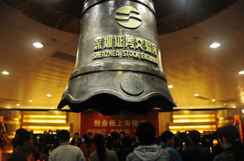 在深圳證券交易所三樓大廳,一個銅質(zhì)的鐘格外引人矚目,它被稱為上市鐘。新華社記者 王浩明/攝 |
