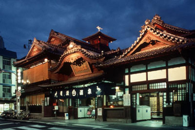 道后溫泉擁有3000年左右的悠久歷史,是日本最古老的溫泉。溫泉浴池的主樓是道后溫泉的象征,建于1894年,是三層木制結(jié)構(gòu)的建筑。據(jù)說動(dòng)畫電影《千與千尋》中的浴池就是以它為原型創(chuàng)作出來的。 雄偉的三層木結(jié)構(gòu)城堡式建筑,是第一個(gè)被指定為重要文物的公共浴場,在現(xiàn)代化的旅館和商店中間,更加顯示出它悠久的歷史和不同的風(fēng)格。屋頂有被稱為振鷺閣的望樓,望樓上的“刻太鼓”在每天早中晚擊打三次,悠遠(yuǎn)的鼓聲在溫泉之鄉(xiāng)久久回蕩。在道后溫泉本館,只洗澡不投宿也可以在大開間或單間的休息室里休息。