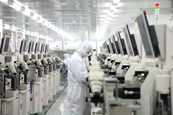北京開發(fā)區(qū)星網工業(yè)園匯聚了全球20多家頂級通信企業(yè),形成了全球獨一無二的零庫存“星網模式”。圖為開發(fā)區(qū)威訊公司生產線。 |