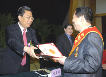 省委書記、省人大常委會(huì)主任趙樂(lè)際為獲得全國(guó)五一勞動(dòng)獎(jiǎng)?wù)碌氖∴]政公司總經(jīng)理馬鳳炯頒獎(jiǎng)。 |
