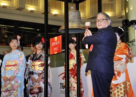 1月4日,在日本東京證券交易所舉行的新年開市“大發(fā)會”上,日本郵政改革和金融事務擔當大臣自見莊三郎(右前)敲響開市鐘。 東京證券交易所當日舉行“大發(fā)會”新年開市儀式。受美股上揚及日元走跌的影響,4日東京股市早盤日經(jīng)225種股票平均價格指數(shù)報10373.85點,上漲144.93點,漲幅為1.42%。