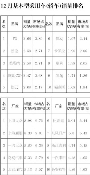 2010年12月,基本型乘用車(轎車)銷售92.08萬輛,環(huán)比下降1.40%,同比增長11.77%。銷量排名前十位的轎車品牌共銷售21.29萬輛,占轎車銷售總量的23%。