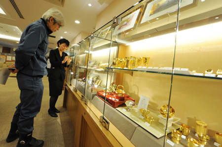 1月18日,在日本東京市中心的一家金店里,一位投資者購(gòu)買(mǎi)金條。在日本,由于對(duì)日幣和經(jīng)濟(jì)的擔(dān)心導(dǎo)致了黃金產(chǎn)品旺銷(xiāo)。近期有消息稱,到2015年,日本全國(guó)債務(wù)規(guī)模將達(dá)到GDP的250%,為世界最高。
