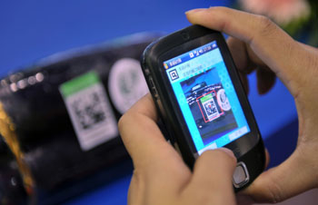 海南省加緊建設瓜菜質量監(jiān)管物聯網,圖為工作人員正在演示用手機掃描瓜菜上的二維碼標貼。記者 郭程