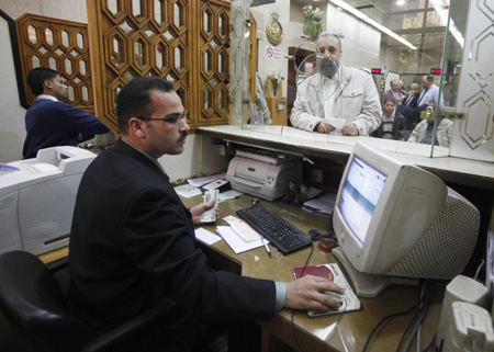 2月20日,埃及首都開羅一家銀行的工作人員在柜臺(tái)前工作。埃及銀行業(yè)關(guān)閉一周后于20日重新開門營業(yè),這顯示出由于政局動(dòng)蕩而損失重大的埃及經(jīng)濟(jì)正開始逐步恢復(fù)正常。近日,中東緊張局勢向巴林、也門和利比亞等國蔓延的趨勢已經(jīng)推動(dòng)國際油價(jià)和金價(jià)強(qiáng)勢上漲,白銀期價(jià)也上漲至31年來新高。