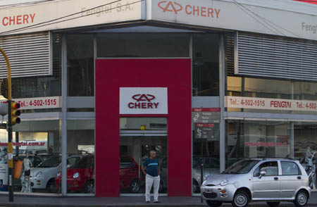 日前,在阿根廷首都布宜諾斯艾利斯,奇瑞索馬克汽車公司的一家門店正在營業(yè)。由于阿根廷政府加強(qiáng)對進(jìn)口產(chǎn)品的限制,由中國、阿根廷和烏拉圭三方合資的奇瑞索馬克公司在烏拉圭生產(chǎn)的奇瑞汽車向阿根廷出口受阻,影響了奇瑞汽車在阿根廷市場的銷售。