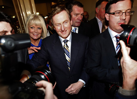 26日,愛(ài)爾蘭反對(duì)黨統(tǒng)一黨領(lǐng)袖恩達(dá)·肯尼(中)在都柏林出席支持者集會(huì)。恩達(dá)·肯尼說(shuō),他所領(lǐng)導(dǎo)的政黨已獲得議會(huì)眾議院選舉的勝利。他執(zhí)政后將盡快就愛(ài)爾蘭援助方案舉行談判,以調(diào)整部分條款,減輕愛(ài)爾蘭的負(fù)擔(dān)。