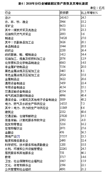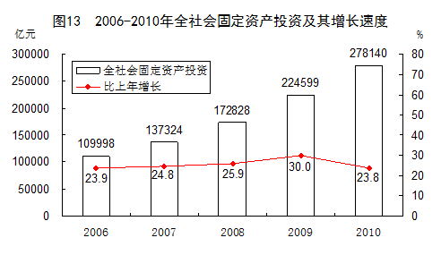 四、固定資產投資 全年全社會固定資產投資278140億元,比上年增長23.8%,扣除價格因素,實際增長19.5%。其中,城鎮(zhèn)投資241415億元,增長24.5%;農村投資36725億元,增長19.7%。東部地區(qū)投資[6]115970億元,比上年增長21.4%;中部地區(qū)投資62894億元,增長26.2%;西部地區(qū)投資61875億元,增長24.5%;東北地區(qū)投資30726億元,增長29.5%。