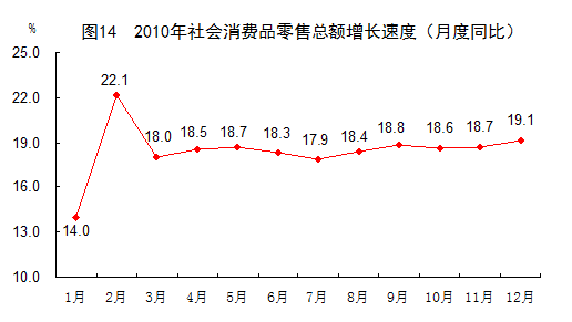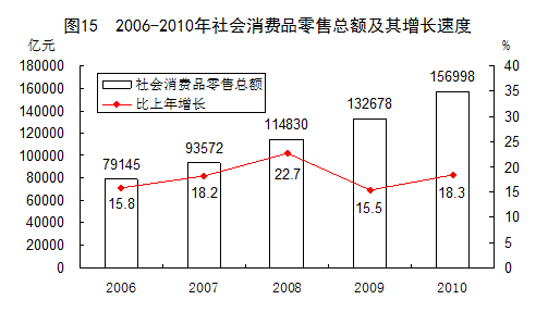 五、國內貿易 全年社會消費品零售總額156998億元,比上年增長18.3%,扣除價格因素,實際增長14.8%。按經營地統(tǒng)計[8],城鎮(zhèn)消費品零售額136123億元,增長18.7%;鄉(xiāng)村消費品零售額20875億元,增長16.2%。按消費形態(tài)統(tǒng)計,商品零售額139350億元,增長18.4%;餐飲收入額17648億元,增長18.1%。