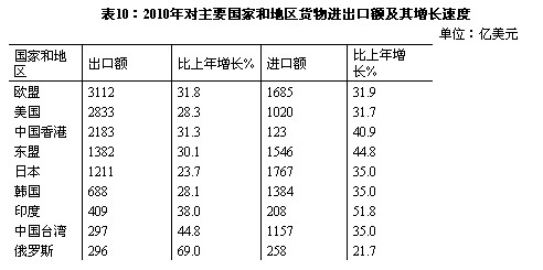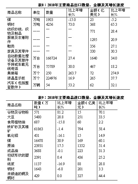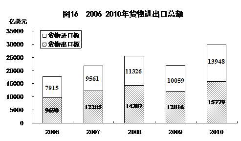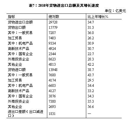 在限額以上企業(yè)商品零售額中,汽車類零售額比上年增長34.8%,糧油類增長27.9%,肉禽蛋類增長21.7%,服裝類增長25.8%,日用品類增長25.1%,文化辦公用品類增長23.5%,通訊器材類增長21.8%,化妝品類增長16.6%,金銀珠寶類增長46.0%,中西藥品類增長23.5%,家用電器和音像器材類增長27.7%,家具類增長37.2%,建筑及裝潢材料類增長32.3%。 六、對外經濟 全年貨物進出口總額29728億美元,比上年增長34.7%。其中,貨物出口15779億美元,增長31.3%;貨物進口13948億美元,增長38.7%。進出口差額(出口減進口)1831億美元,比上年減少126億美元。
