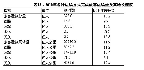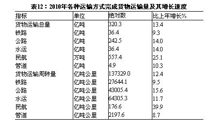 全年對外承包工程業(yè)務完成營業(yè)額922億美元,比上年增長18.7%;對外勞務合作完成營業(yè)額89億美元,與上年持平。 七、交通、郵電和旅游 全年貨物運輸總量320億噸,比上年增長13.4%。貨物運輸周轉量137329億噸公里,增長12.4%。