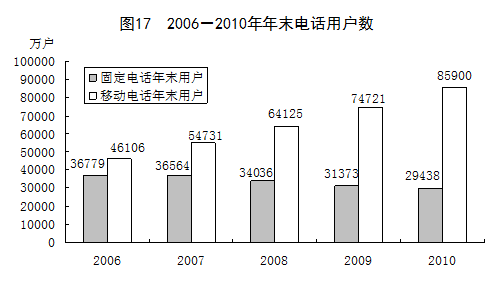 全年規(guī)模以上港口完成貨物吞吐量80.2億噸,比上年增長15.0%,其中外貿貨物吞吐量24.6億噸,增長13.6%。港口集裝箱吞吐量14500萬標準箱,增長18.8%。 年末全國民用汽車保有量達到9086萬輛(包括三輪汽車和低速貨車1284萬輛),比上年末增長19.3%,其中私人汽車保有量6539萬輛,增長25.3%。民用轎車保有量4029萬輛,增長28.4%,其中私人轎車3443萬輛,增長32.2%。 全年完成郵電業(yè)務總量[9]32940億元,比上年增長20.6%。其中,郵政業(yè)務總量1985億元,增長21.6%;電信業(yè)務總量30955億元,增長20.5%。全年局用交換機容量減少2707萬門,總容量46559萬門;新增移動電話交換機容量[10]6433萬戶,達到150518萬戶。固定電話年末用戶29438萬戶。其中,城市電話用戶19662萬戶,農村電話用戶9776萬戶。新增移動電話用戶11179萬戶,年末達到85900萬戶。其中,3G移動電話用戶[11]4705萬戶。年末全國固定及移動電話用戶總數達到115339萬戶,比上年末增加9244萬戶。電話普及率達到86.5部/百人;ヂ摼W上網人數4.57億人,其中寬帶上網人數4.50億人;互聯網普及率達到34.3%。