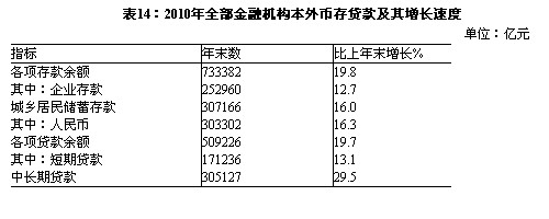 年末全部金融機構本外幣各項存款余額73.3萬億元,比年初增加12.1萬億元。其中人民幣各項存款余額71.8萬億元,增加12.0萬億元。全部金融機構本外幣各項貸款余額50.9萬億元,增加8.4萬億元。其中人民幣各項貸款余額47.9萬億元,增加7.9萬億元。