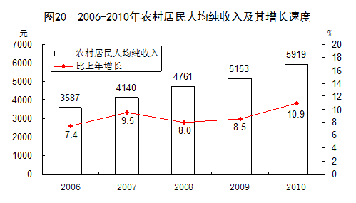 全年農村居民人均純收入5919元,剔除價格因素,比上年實際增長10.9%;城鎮(zhèn)居民人均可支配收入19109元,實際增長7.8%。農村居民家庭食品消費支出占消費總支出的比重為41.1%,城鎮(zhèn)為35.7%。按2010年農村貧困標準1274元測算,年末農村貧困人口為2688萬人,比上年末減少909萬人。