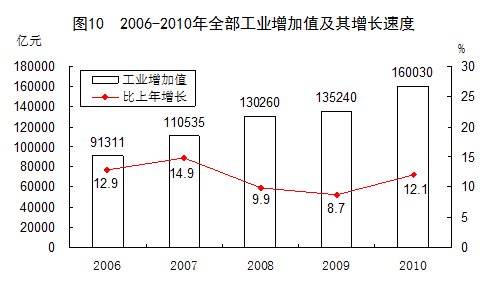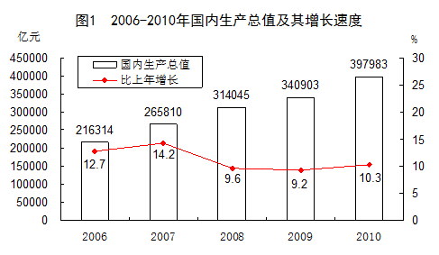 2011年2月28日 2010年,面對復雜多變的國內外經濟環(huán)境和各種重大挑戰(zhàn),全國各族人民在黨中央、國務院的堅強領導下,以鄧小平理論和“三個代表”重要思想為指導,深入貫徹落實科學發(fā)展觀,堅持實施應對國際金融危機沖擊的一攬子計劃,加快轉變經濟發(fā)展方式和經濟結構戰(zhàn)略性調整,國民經濟保持了平穩(wěn)較快發(fā)展,各項社會事業(yè)取得新的進步。 一、綜合 初步核算,全年國內生產總值[2]397983億元,比上年增長10.3%。其中,第一產業(yè)增加值40497億元,增長4.3%;第二產業(yè)增加值186481億元,增長12.2%;第三產業(yè)增加值171005億元,增長9.5%。第一產業(yè)增加值占國內生產總值的比重為10.2%,第二產業(yè)增加值比重為46.8%,第三產業(yè)增加值比重為43.0%。