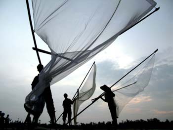 拉大網(wǎng)的時(shí)候,一般由被叫做“網(wǎng)頭”的人根據(jù)天氣、潮汐、風(fēng)向和流水確定,大網(wǎng)也有大、中、小3種,其中大網(wǎng)長(zhǎng)三四千米,中網(wǎng)長(zhǎng)一二千米,小網(wǎng)則在千米以下,網(wǎng)寬均在4-6米之間。拉大風(fēng)時(shí),由參加拉網(wǎng)的人把網(wǎng)拉到竹排或者小艇上,先固定一頭,再由“網(wǎng)頭”一邊駕艇劃向海里,一邊呈半弧形撒下網(wǎng)繩和大網(wǎng),接著由岸上兩組人分別把住大網(wǎng)的兩頭,然后往岸上慢慢地一步一退地把大網(wǎng)收攏上來。網(wǎng)拉靠岸之時(shí),就可把被圍困在大網(wǎng)內(nèi)的魚、蝦、蟹、鱟等一一捕捉,通常一網(wǎng)能收獲200公斤左右的魚。在20世紀(jì)60年代,村民們?cè)?jīng)一網(wǎng)就能打上2000多公斤的魚,其中曾經(jīng)創(chuàng)下一網(wǎng)拉上5000多公斤的紀(jì)錄。