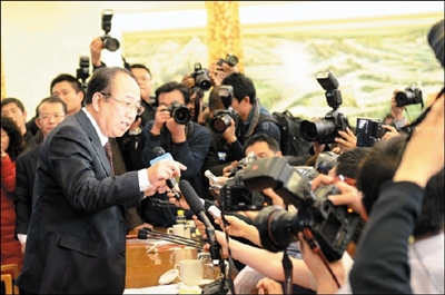 趙啟正會后遭遇記者“圍堵”。范繼文