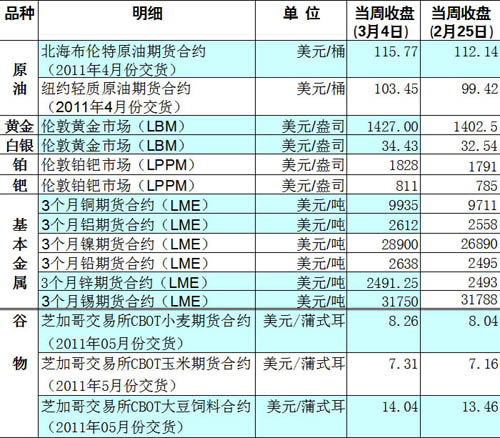 國(guó)際大宗商品期貨價(jià)格明細(xì)表[2011-03-07]