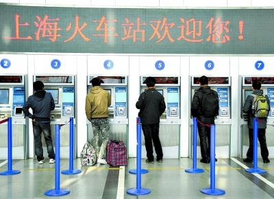 圖為3月8日旅客在上;疖囌咀灾燮睓C(jī)前購買高鐵車票!