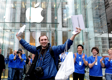 3月11日,在紐約曼哈頓第五大道蘋(píng)果旗艦店外,一名顧客向人們展示他剛買(mǎi)到的蘋(píng)果iPad2。當(dāng)日,蘋(píng)果第二代平板產(chǎn)品iPad2在美國(guó)上市銷(xiāo)售。