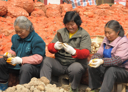 魔芋是一種富含優(yōu)質(zhì)膳食纖維的植物,具有防止肥胖、三高、糖尿病等功能,是天然的保健食品和醫(yī)藥原料,市場前景看好。圖為貴陽市修文縣久長鎮(zhèn)蘆山村村民在給魔芋種“切芽”!