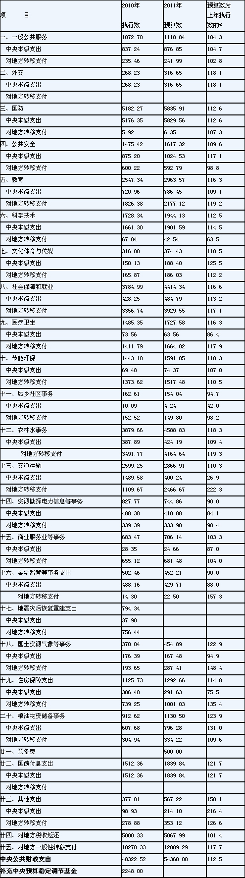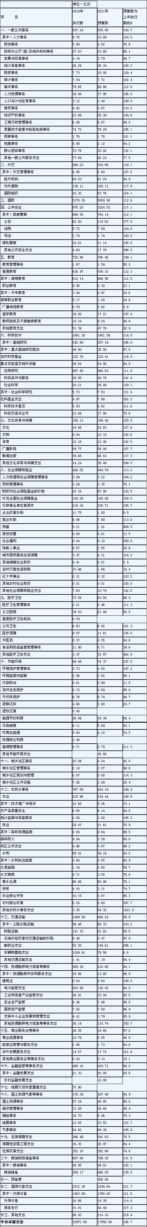 2011年中央公共財政支出預算表