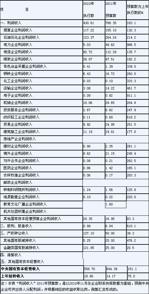 利潤收入788.35億元,加上股利、股息收入6.04億元,以及產權轉讓收入50億元,2011年中央國有資本經營收入預算數(shù)為844.39億元。2010年結轉收入14.17億元。