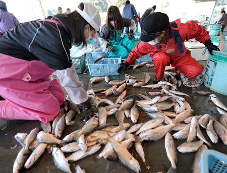 4月6日,人們在日本茨城縣北茨城的一個魚市上分揀剛剛打撈的活魚。 日本厚生勞動省5日為水產品設定放射性碘活度標準,允許水產品中放射性碘活度上限為每千克2000貝克勒爾,這一標準與蔬菜(不包括根莖類和薯類)放射性碘活度標準相同。4月1日,茨城縣近海捕撈的玉筋魚被查出放射性碘活度達每千克4080貝克勒爾,這是厚生勞動省緊急制定相關標準的直接原因。