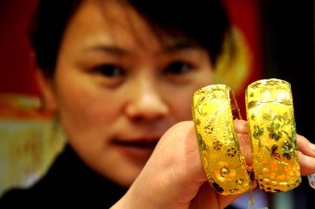 圖為江蘇連云港一家金店的工作人員展示黃金飾品。