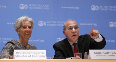 據(jù)外電報道,經(jīng)濟合作與發(fā)展組織(OECD)上調(diào)了對法國經(jīng)濟增長的預期,該組織秘書長安赫爾·古里亞表示,法國經(jīng)濟復蘇穩(wěn)健,預計今年法國經(jīng)濟將增長約2%。 圖為11日安赫爾·古里亞和法國經(jīng)濟、財政和工業(yè)部長克里斯蒂娜·拉加德在經(jīng)合組織發(fā)布的法國經(jīng)濟形勢報告的新聞發(fā)布會上。