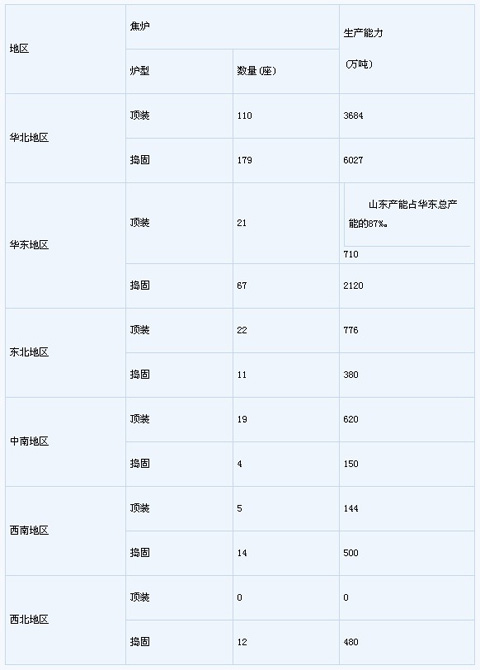 3.55億噸,其中晉、冀、魯三省的總產(chǎn)量超過1.56億噸,占全國總量的44.2%,如再加上內(nèi)蒙古、河南,五省的焦炭總產(chǎn)量達1.96億噸,超過國內(nèi)總產(chǎn)量的55.5%。 如按獨立焦化企業(yè)計算,截至到2009年,我國規(guī)模以上的獨立焦化企業(yè)共有195家,焦爐464座,產(chǎn)能合計1.56億噸。其中,華北地區(qū)焦化企業(yè)122家,焦爐289座,設(shè)計產(chǎn)能9711萬噸,分別占企業(yè)總數(shù)、焦爐總數(shù)和獨立焦化總產(chǎn)能的62.56%、62.28%和62.25%。其中,山西(91家企業(yè)、98座焦爐、7251萬噸產(chǎn)能)、河北(23家企業(yè)、25座焦爐、2252.6萬噸產(chǎn)能)兩省占華北地區(qū)總產(chǎn)能的97.86%;華東地區(qū)共有焦化企業(yè)35家、焦爐88座、產(chǎn)能2830萬噸,分別占各自總量的17.95%、18.97%和18.14%,是我國第二大獨立焦化企業(yè)聚集區(qū)。其中,有31家企業(yè)的84座焦爐分布在山東省,占華東地區(qū)總產(chǎn)能的87%。