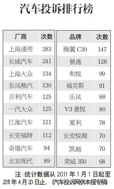 汽車投訴排行榜[2011-04-21]